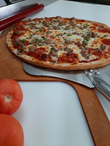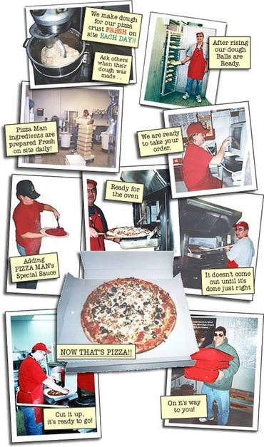 Our Pizza's are not pre-made. Each PIZZA MAN PIZZA is individually prepared with our fresh quality ingredients, topped with Real Wisconsin Dairy Cheese, and slow baked the old fashioned way. It takes time to properly prepare a quality product and we wouldn't want it any other way!
